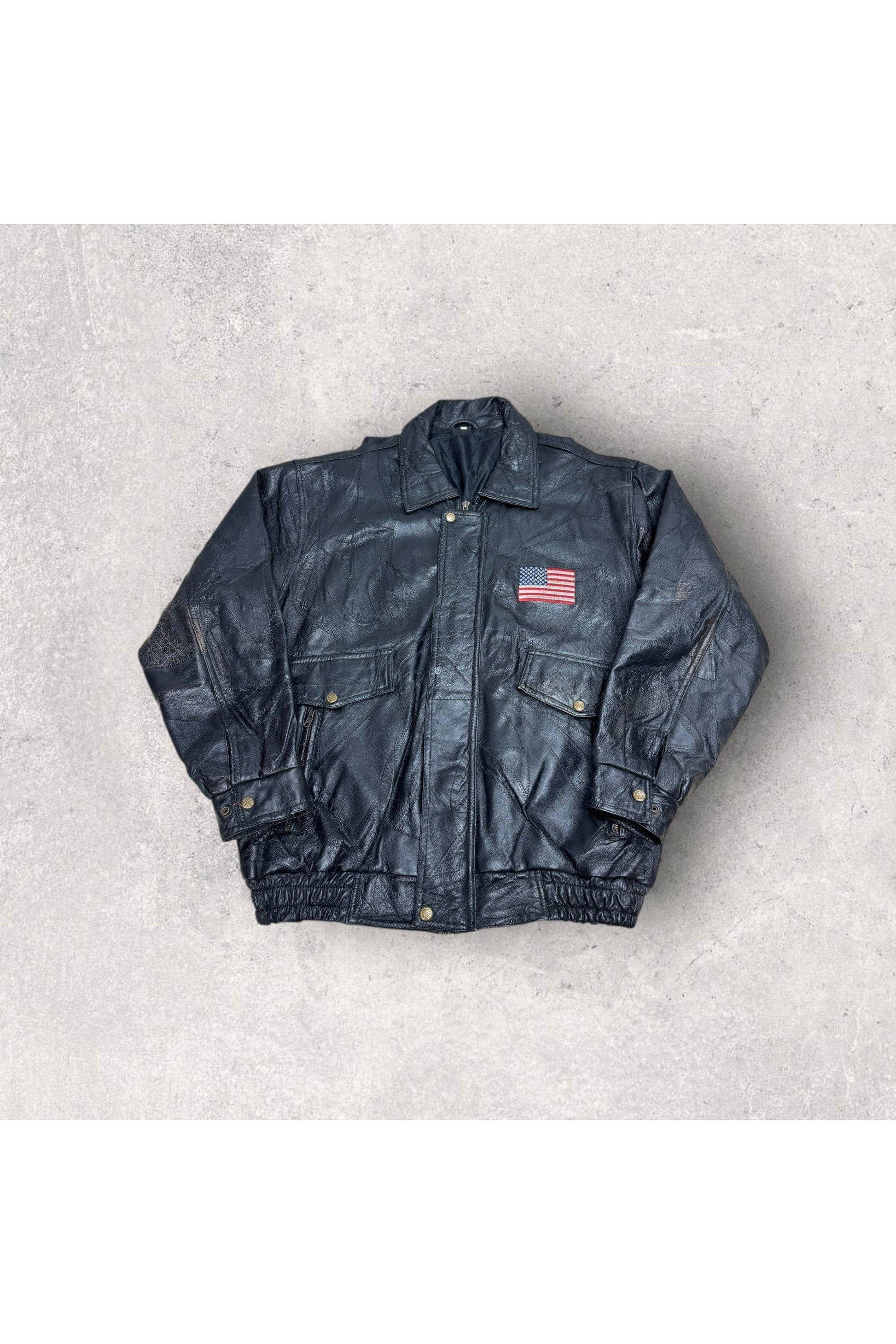 Vintage Embroidered American Flag Bald Eagle Leather Bomber Jacket- L